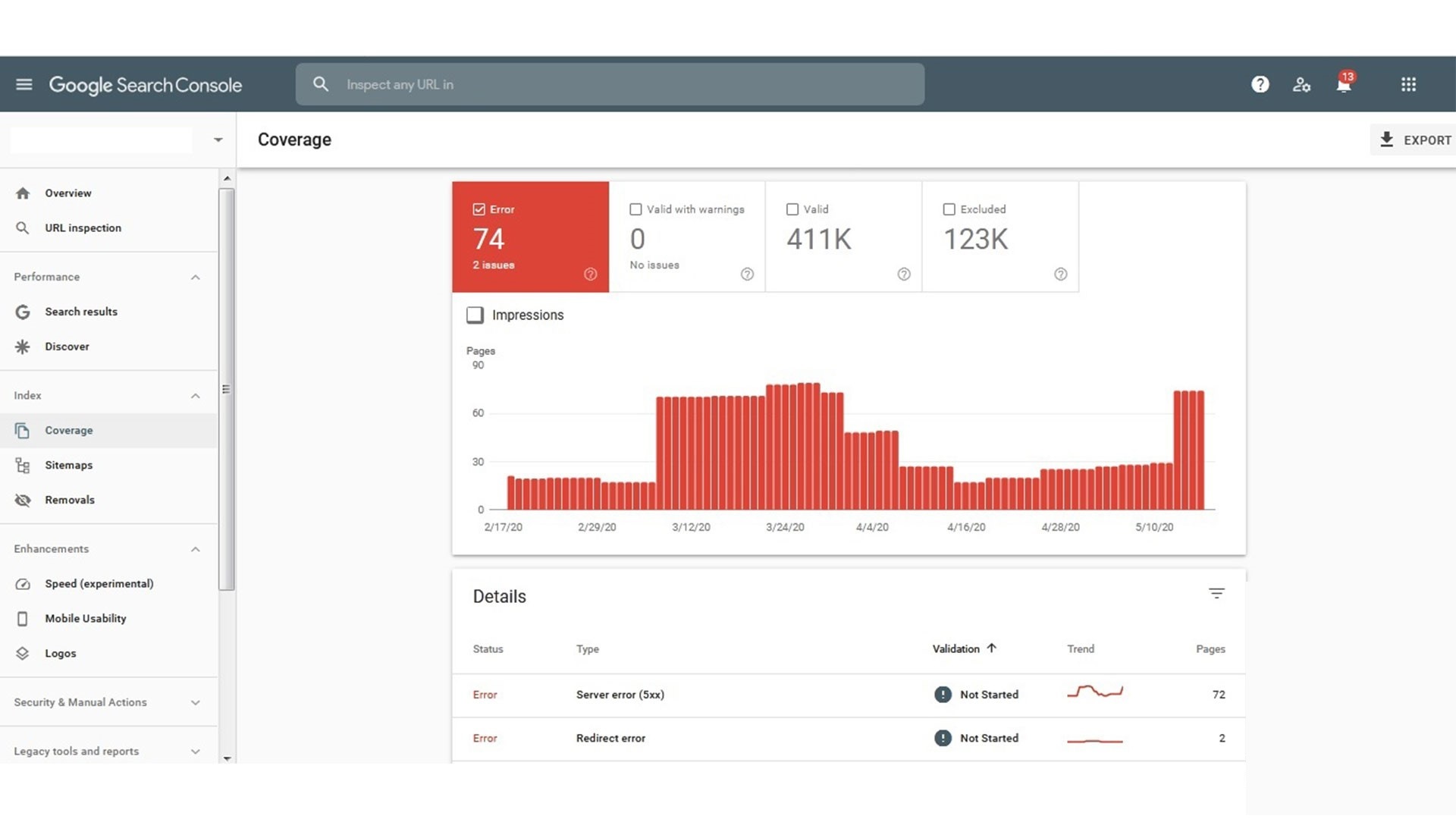 یکی از قابلیتهای بسیار کاربردی سرچ کنسول گوگل، گزارش Index Coverage است. این قابلیت(که از طریق منوی سمت راست سرچ کنسول قابل دسترسی است) فهرستی از همه صفحاتی که گوگل برای مرور و ایندکس کردن آنها تلاش کرده به همراه خطاهای احتمالی که در این مسیر با آنها مواجه شده است را به شما نشان میدهد.